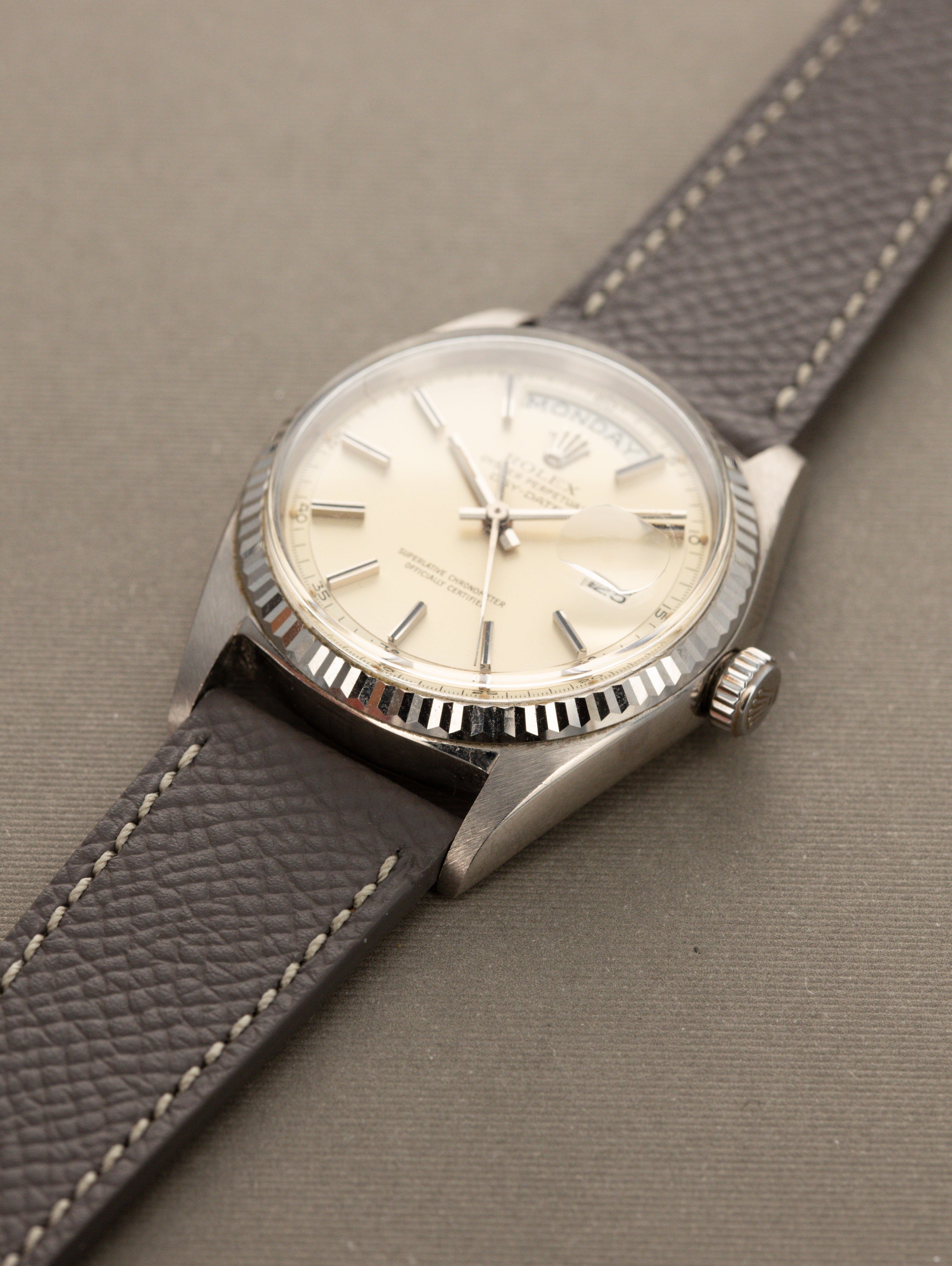 The Day-Date was available for many years on a matching solid gold bracelet (called a 'President' bracelet), but also on a leather strap like the example that we have here.