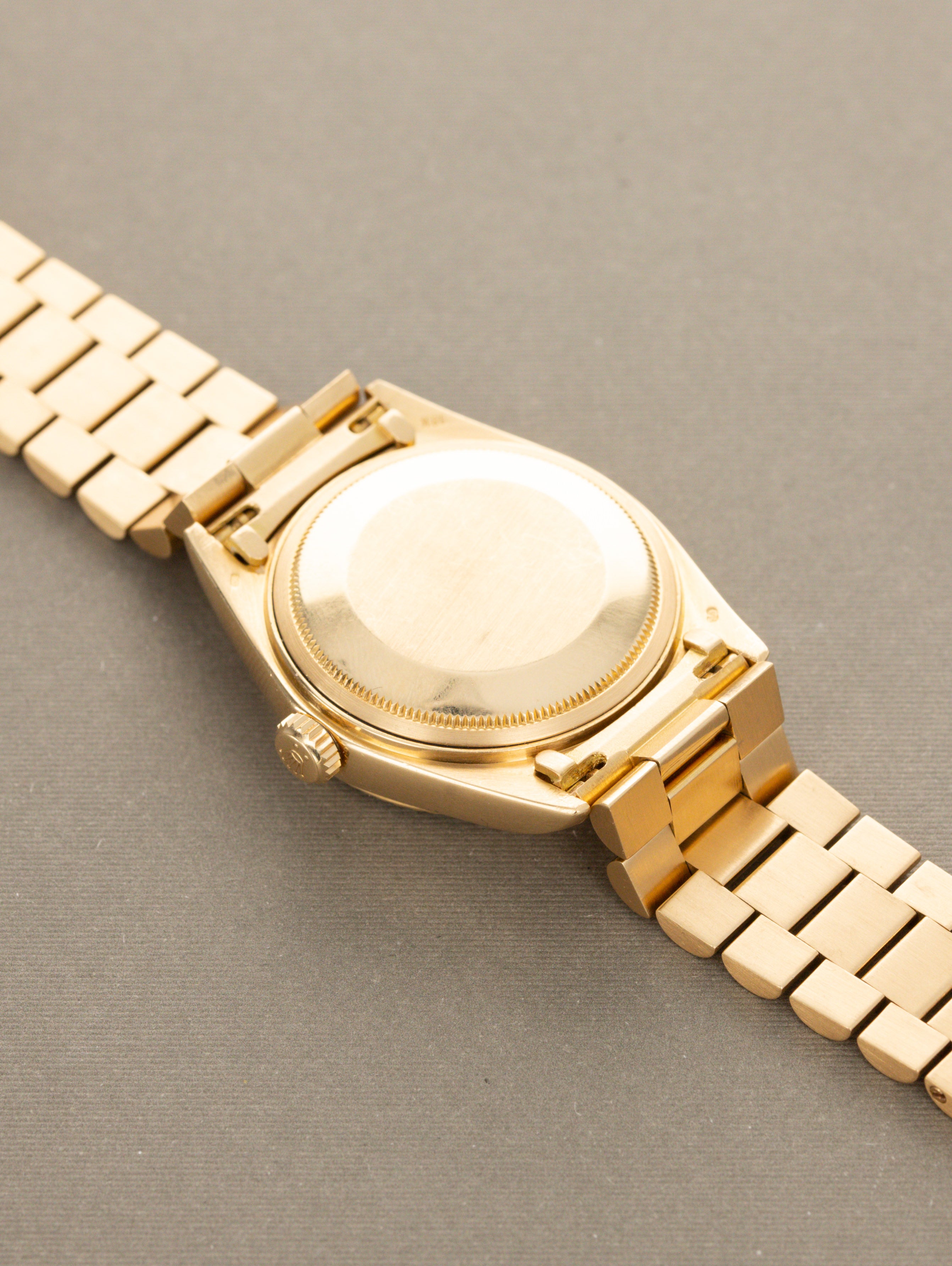 The Day-Date was available for many years on a leather strap with a matching gold buckle, but also on a solid gold bracelet (called a 'President' bracelet), like the example that we have here.